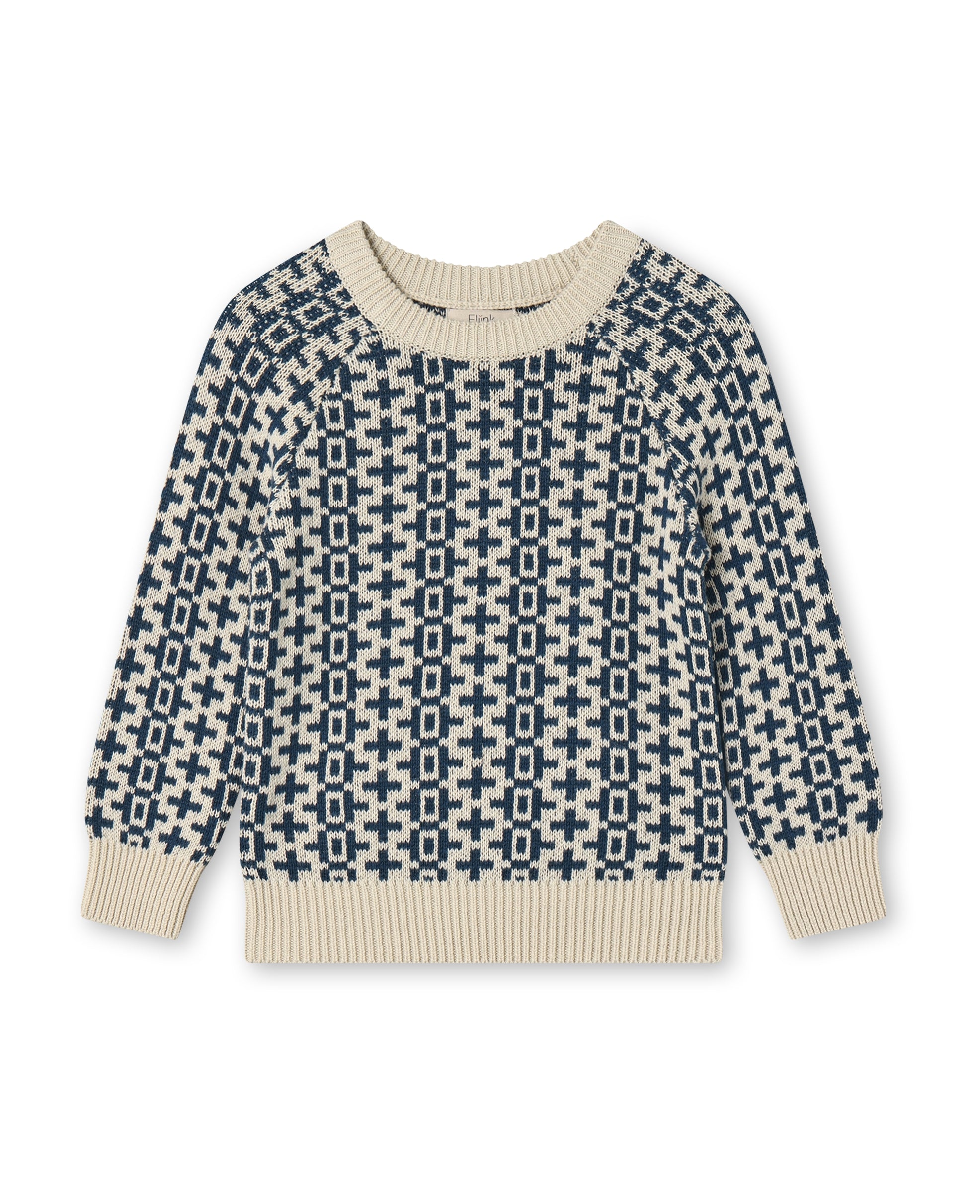 Klassisk og tidløs striktrøje fra Fliink med et smukt nordisk mønster over hele kroppen. Sweateren har raglanærmer og en rund hals, samt ribkanter ved ærmer, halsudskæring og forneden, som giver et flot og afslappet look.