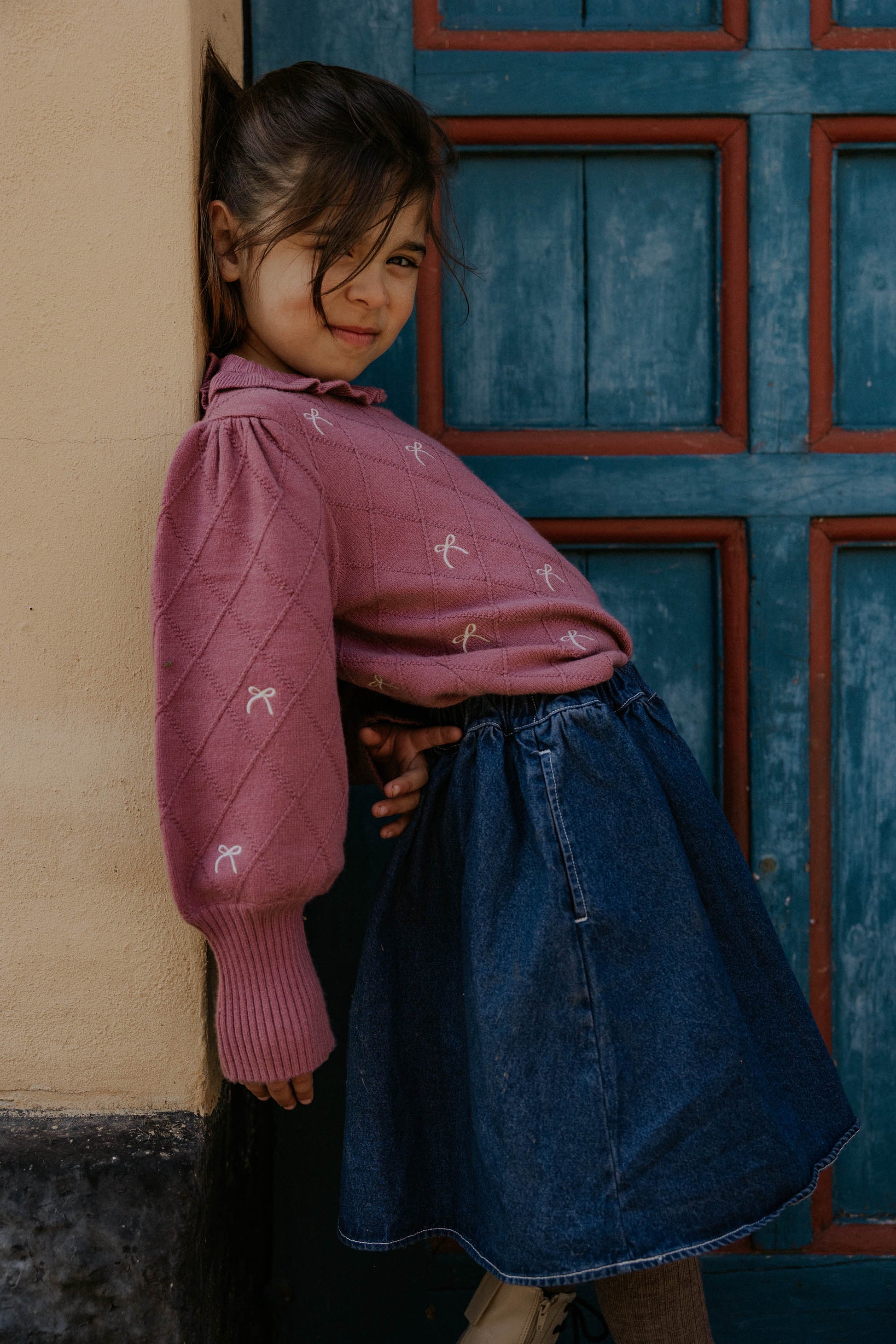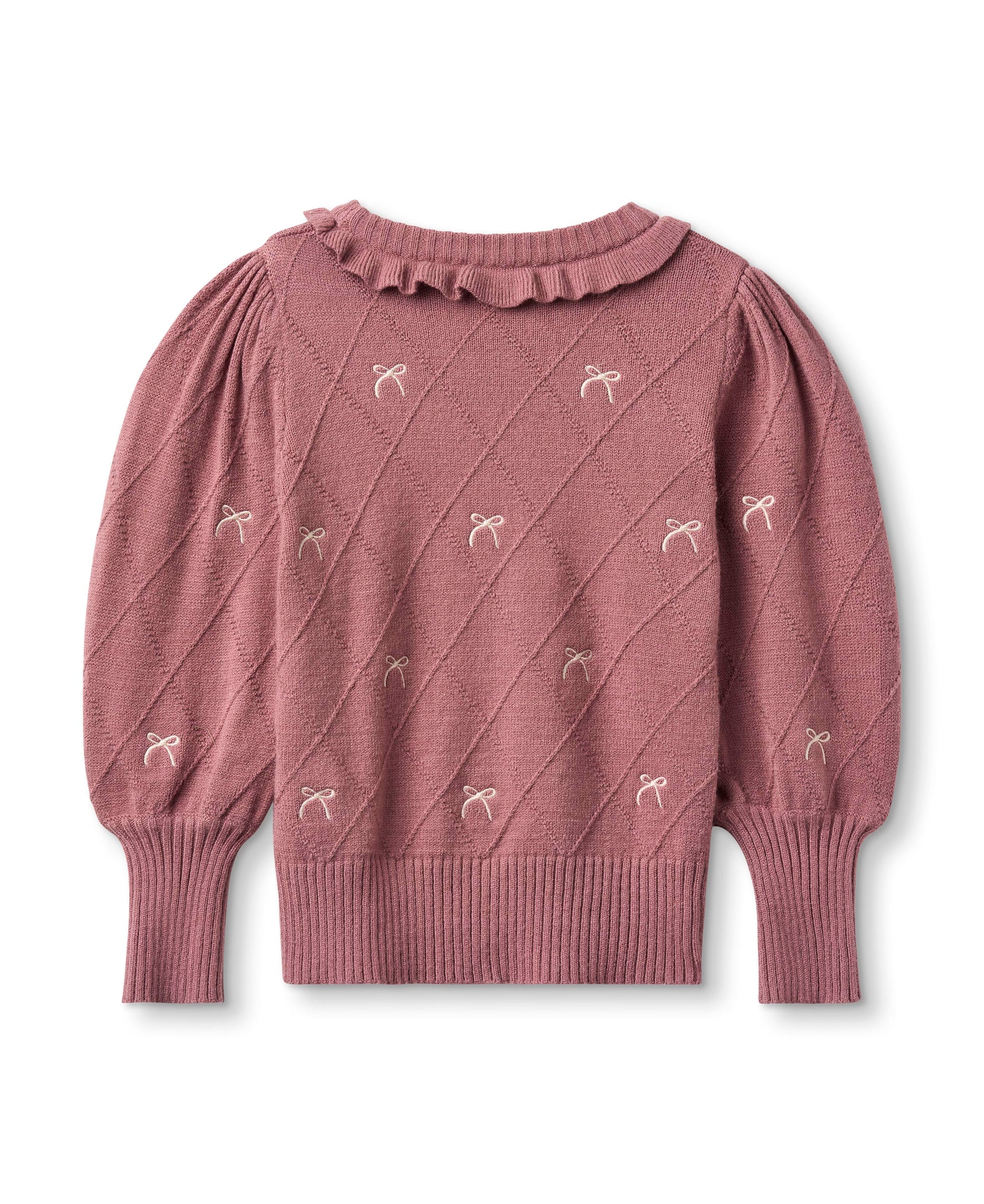 Elegant og feminin strikbluse fra Fliink i en smuk støvet rosa nuance, dekoreret med små sløjfer og en fin flæsekant ved halsen. Blusen har ballonærmer med ribkanter, der giver en sød silhuet og en behagelig pasform.