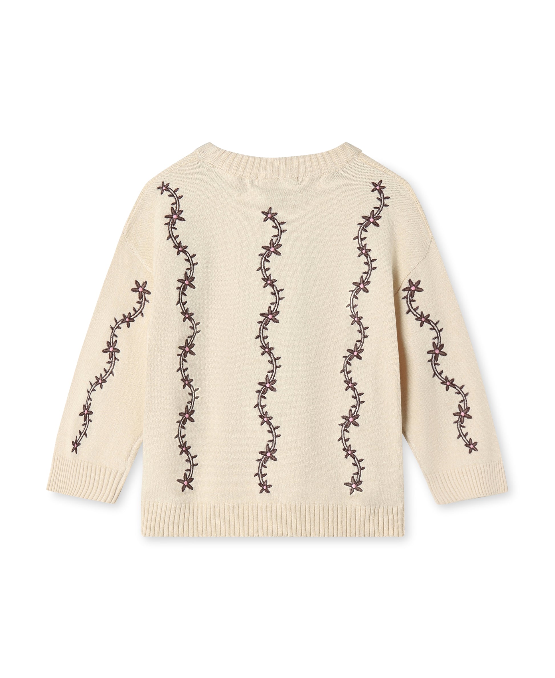 Beige strikket sweater i blød kvalitet med smukke, broderede blomster på både ærmer og krop.