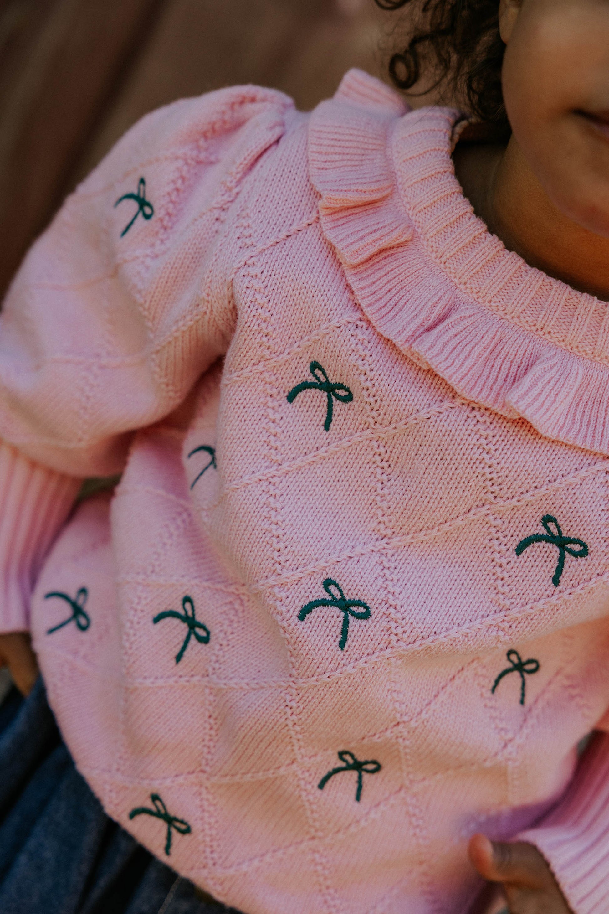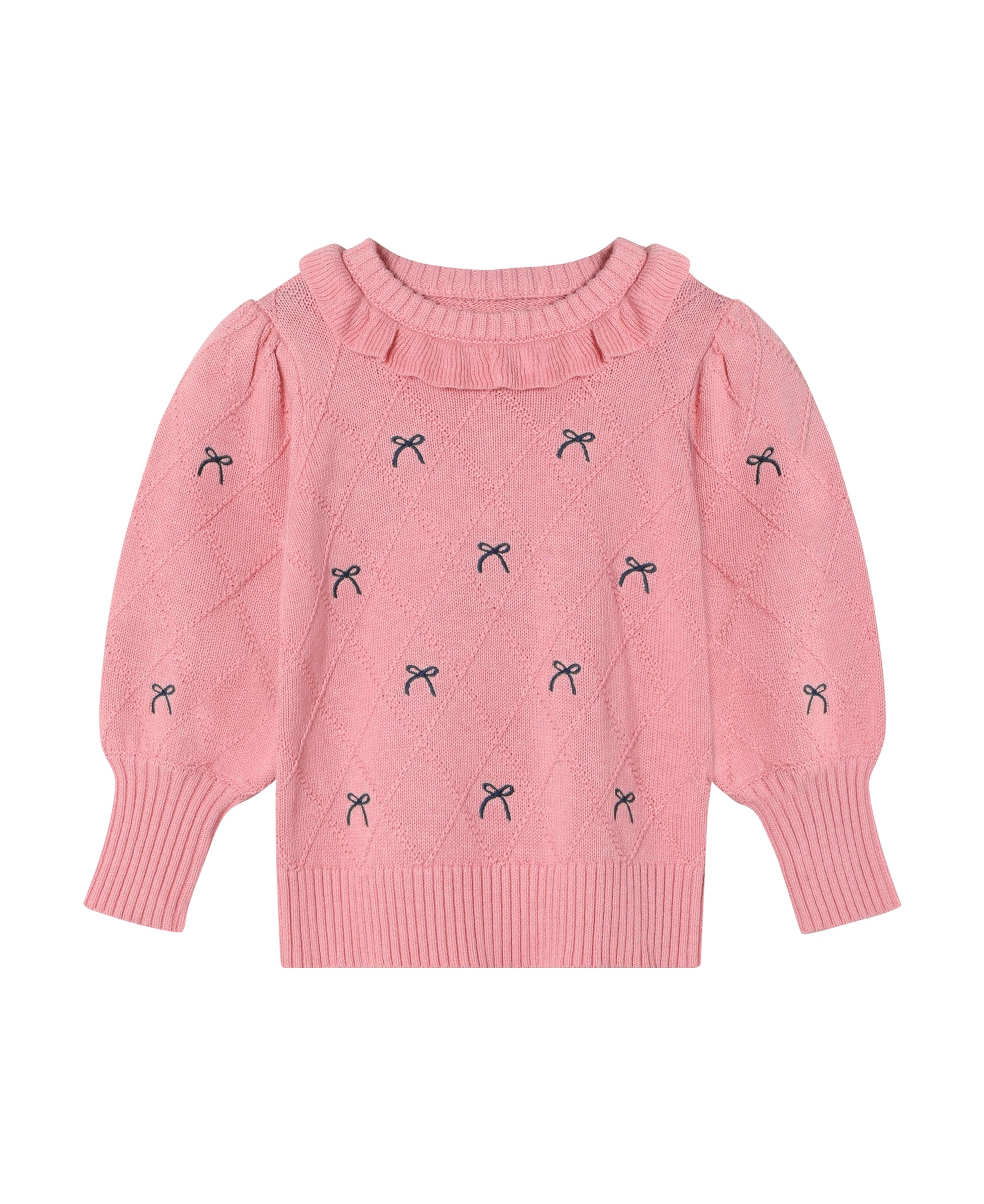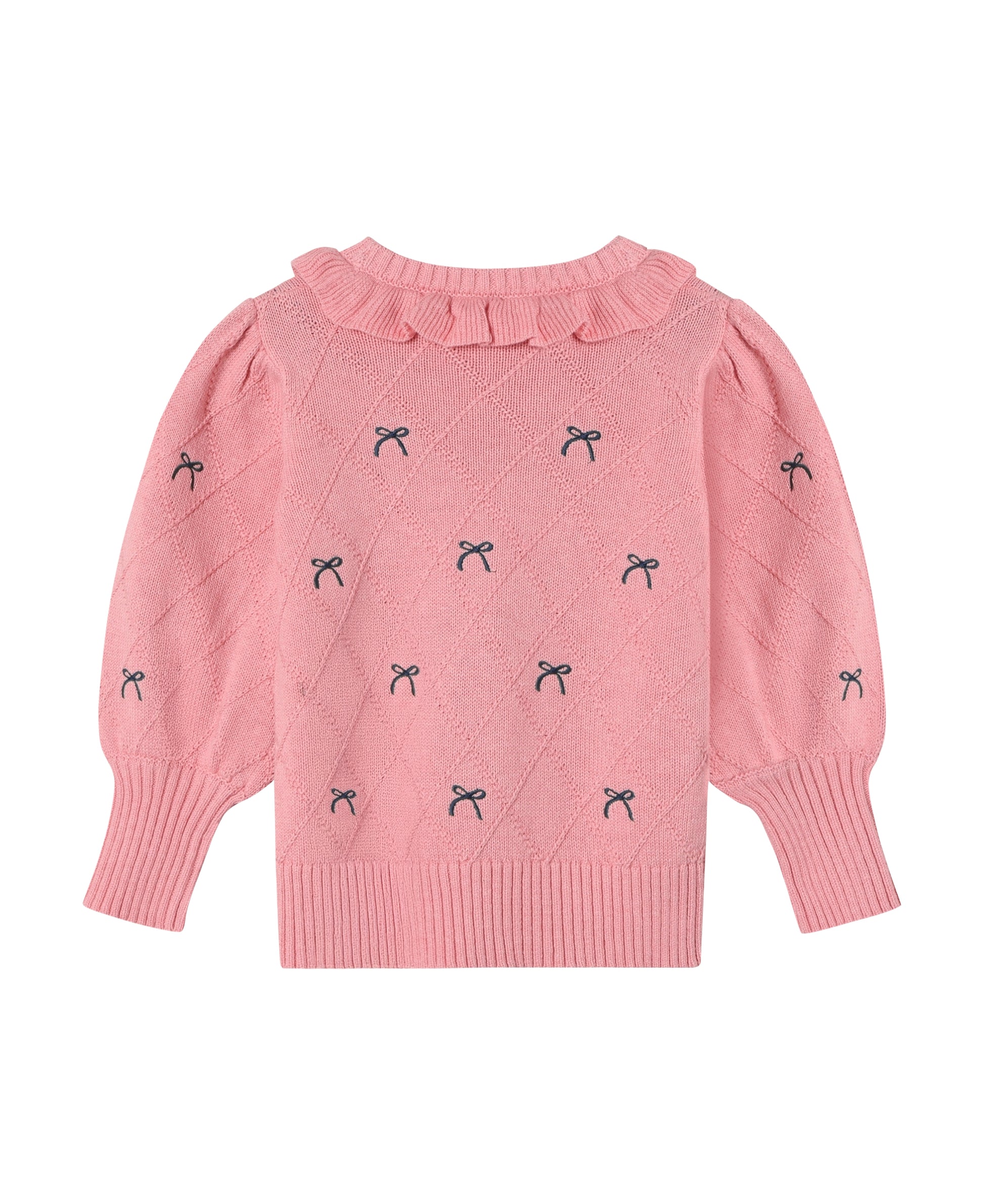 Elegant strikbluse fra Fliink i en blød og varm kvalitet med et smukt harlekinmønster, der giver designet dybde og struktur. Blusen er dekoreret med små, broderede sløjfer på både for- og bagside samt ærmer, som tilfører et sødt og legende udtryk. De puffede ærmer med fine læg ved skuldrene og høj ribkant ved håndleddene giver et feminint look, mens den runde hals med lille krave fuldender designet.
